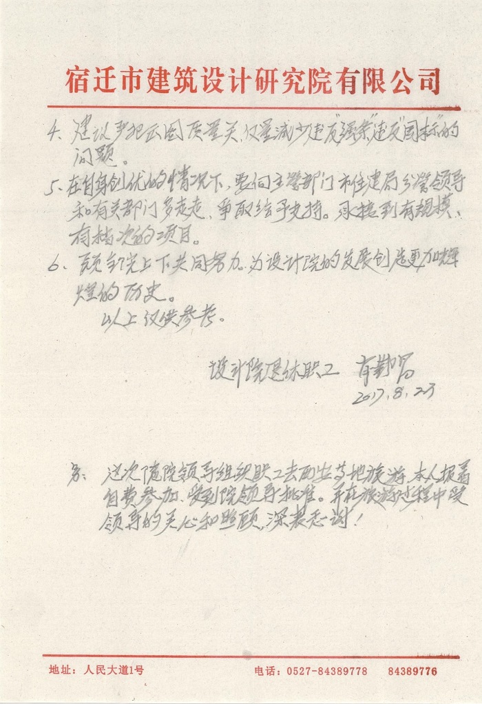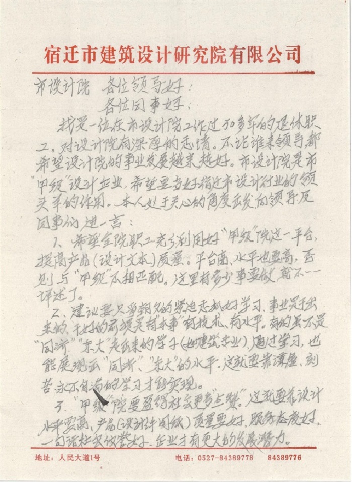 我是一位在市設計院工作過30多年的退休職工,對設計院有著深厚的感情。不論誰來領導,都希望設計院的事業發展越來越好。市設計院是是甲級設計企業,希望要當好宿遷市設計行業的領頭羊的作用。本人處于關心的角度出發,向領導及同事們進一言: